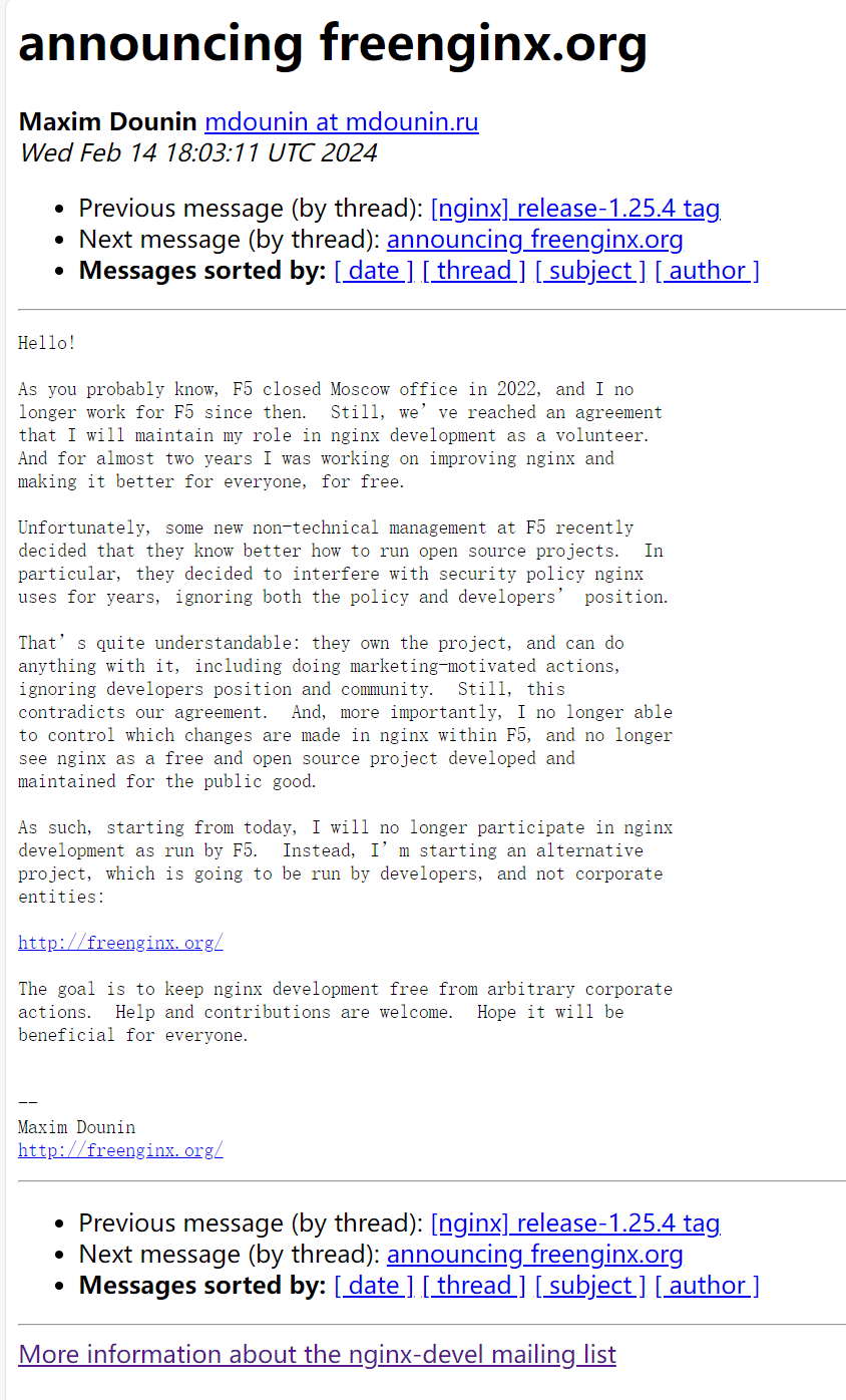Maxim Dounin 决定分叉 Nginx 是因为与 F5 发生了分歧,F5 于 2019 年收购了 Nginx 公司。Dounin 在宣布 Freenginx 时解释道: